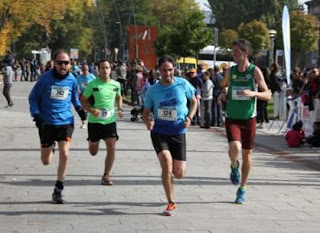 Los entrenamientos previos habían ido por buen camino: rodajes a distintos ritmos, trabajo de cuestas, tiradas largas... Pero llegado el día parecía que todo se esfumaba y ciertos nervios hicieron presencia en los estómagos de los nuestros. A la postre el calor fue factor determinante en el transcurrir de la carrera para todos los participantes. Se hizo muy necesaria la hidratación y medir muy bien las fuerzas. Isidoro realizó, como diría el clásico, una carrera de "manual", yendo de menos a más, con una segunda parte de carrera fenomenal y disfrutando de todos los tramos de la carrera, por duros que fuesen, gracias al incomparable ambiente que brindaba el público. En el lado contrario Antonio, carrera que se le hizo demasiado larga por un principio demasiado rápido. Las sensaciones iniciales le animaron a un ritmo vivo pero la carrera y el calor no perdonaron. Una buena pájara hizo su presencia a mitad de recorrido. Que gran suerte la suya y "trabajo de equipo" el que hizo Roberto tirando de él en la última dura cuesta y haciendo que la parte final fuese menos dura. Impecable la carrera del "veterano". Sabedor de lo exigente del trazado dosificó fuerzas, ritmos y esfuerzos; sabiendo que eran muchos los kilómetros y las cuestas. Carrera también de menos a más en la que, como ya hemos mencionado, derrochó compañerismo haciendo que Antonio recuperase fuerzas y entraron en meta de la mano.